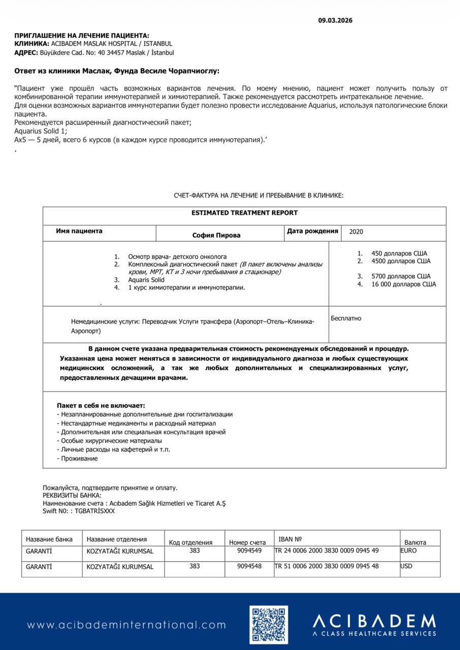 The doctors said Sofia needs treatment in a specialized clinic. ACIBADEM MASLAK HOSPITAL is ready to accept our daughter and begin the necessary therapy.