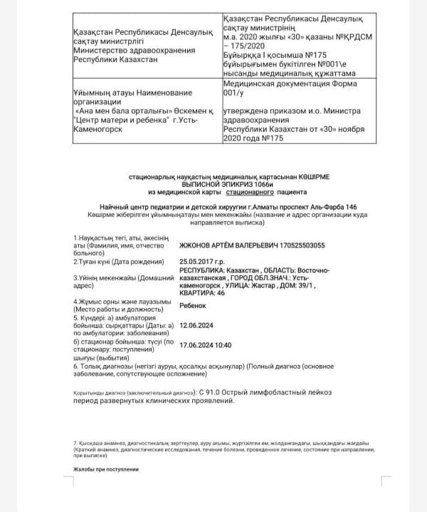 At that moment, Artem felt very bad, his blood counts dropped to zero. In an emergency, Artem was taken to intensive care, where they gave him a blood transfusion, a platelet transfusion, endless injections, and Bioven, which is useful for immunoglobulin. My baby has been injected for days. On Monday, June 24, 2024, we were transferred to the Central Medical and Radiology Center in Ust-Kamenogorsk, they took my child away for an emergency puncture, which was done to the baby without anesthesia or painkillers into the chest. I can’t forget how Artem screamed in pain, asking for help with hysterics. The doctors simply pushed me out and told me to wait. Later they told me that they couldn’t do the test because the blood had clotted! My baby was in pain, and they couldn’t... The next day, they took a bone marrow puncture from the hip bone, thank God under anesthesia, after lunch we heard the following: Artem has blood cancer. I immediately began to study the information, talk to mothers of similarly sick children, and everyone claims that treatment is better abroad. So I came across a clinic in Turkey, where we already discussed our treatment and we were told that there is a 93% chance that Artem would go into remission. Now the cost of treatment is 16000$. The cost of life is very large, but I believe that together we can save a life. Every small donation gives the opportunity to be healthy. Please help me save my baby.🙏🏻⚠️🆘