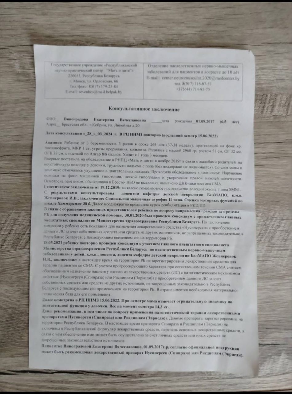 🆘⚠️I am the mother of a little girl, Ekaterina Vinogradova, from Kobrin. My daughter has SMA (Spinal Muscular Atrophy Type 2), and the disease causes atrophy of the muscles of the whole body, ⚠️ swallowing and breathing. Katyusha will be 7 years old on September 1. Katyusha has already lost the ability to walk. Katyusha was diagnosed in December 2019. An expensive drug, has been developed for this, which costs more than millions of dollars 💲 US dollars. The drug is administered up to 21 kg. Katyusha already weighs 17 kg. We ask all caring people to help Katyusha collect money for an injection. We will be grateful in advance for your help. Together we can save Katyusha's life.❗
