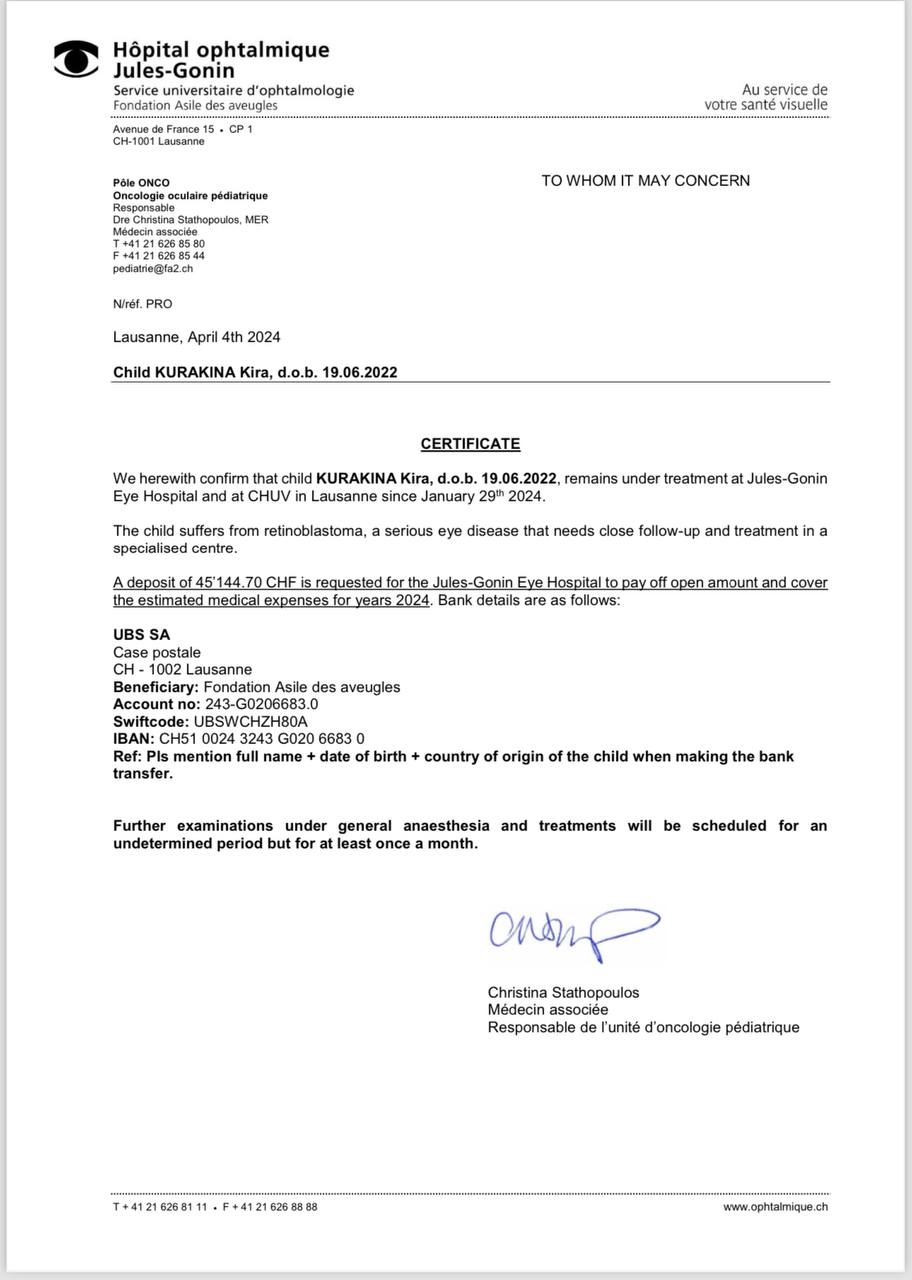 I can't let this disease take her away from us. I found a clinic in Switzerland where there is a chance that Kira will keep her eye and beat cancer. The clinic has sent us an invitation and a bill for treatment, the amount of which is 2,150,000 rubles, and I cannot raise such a sum on my own. 😓
