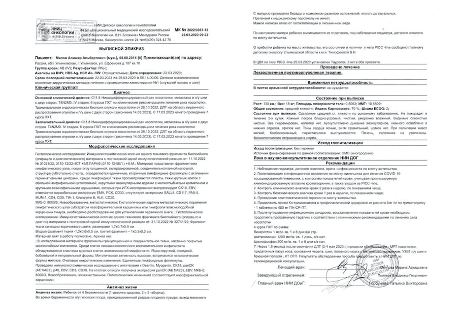 Every day was a fight for us ⚔️, each treatment was a new challenge 🛑. We went through 6 courses of chemotherapy 💉 and 1 course of radiation therapy 🌞, but the disease did not stop 😓. After treatment, Alisher had pneumonia 😷, and when we took a coronavirus test, it was positive 😔. We thought we had survived the worst, but then it only got worse 😢. We all went through terrible fear for his life 😞 and lost hope for treatment in Russia, since we were denied further treatment 😔, and we were forced to leave for Israel 🇮🇱.