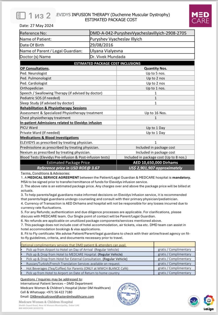 But there is a chance! 🙏 The drug Elevidys is the only hope that can stop the progression of the disease and give Slava a chance at a normal life. 💖 But its cost is too much for our family: 2,185,000 rubles. We cannot raise such an amount without your help. 😢