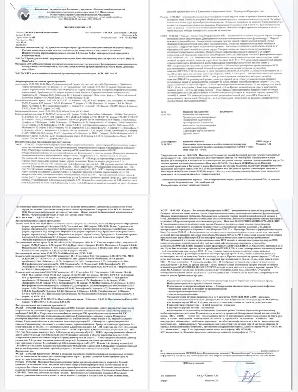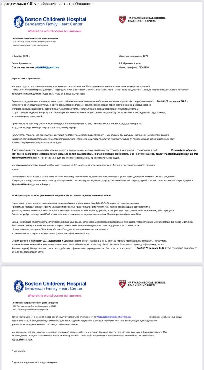 In 2023, the second operation was performed - a bidirectional cavopulmonary anastomosis (Glenn operation), also on an open heart using a heart-lung machine, 7 days of intensive care on artificial ventilation. The child's saturation, after this operation, is within 87-88%. Six months after the operation, during the examination, it turned out that Anton had aortic recoarctation and narrowing of the left pulmonary and subclavian arteries. The child underwent endovascular surgery, in which the narrowed areas were inflated with a balloon. Now the child will have to undergo such operations every year, at least until he is five years old. In 2024, Anton also underwent such an operation. Due to the fact that we did not have time to pay the invoice this year, a similar operation is scheduled for July 2025. Considering 2 open-heart surgeries, this will be the fifth... The child is very active and inquisitive, but shortness of breath constantly bothers him, even when he just picks up the pace. He started walking only at 1 year and 4 months, after a course of massage and light gymnastics. With active movements, cyanosis of the face and nails appears. At such moments, my heart just stops... He is only 2 years old, and what next????? Fear entered our souls back in 2022, never letting go of its shackles... We realized one thing... It is not a fear when you yourself are sick. It is a fea when your child is sick, and you are powerless. Where can we get such an amount. The famous pediatric cardiac surgeon from the USA Pedro del Nido is ready to perform the third heart surgery. Children with such defects as hypoplastic left heart syndrome and a single functional ventricle are brought to him from all over the world. This is a chance for our child. We also need to solve the problem with the aorta and pulmonary artery. The cardiac surgeon from the USA wrote that the surgery must be performed before the age of 3. The Boston Children's Hospital clinic was not chosen by chance, because cardiac surgeon Pedro del Nido works there. Since cardio moms closely follow the news about children with similar defects, we have seen what miracles he works. The cardiac surgeon at Boston Children's Hospital cannot confirm what kind of surgery my son will have until the child undergoes the necessary examinations directly in the clinic and a 3D model of the heart is made. Due to the complexity of the anatomy of the aorta and arteries. Children with hypoplastic left heart syndrome have a harder time with surgeries and the postoperative period, as this is one of the most severe heart defects. The right ventricle, unfortunately, is not systemic and as powerful as the left. Considering that the United States has accumulated vast experience in such defects, there are people with such a defect who are already over 40 years old. There is also high-tech equipment, a different level of intensive care and the world-famous pediatric cardiac surgeon Pedro del Nido, who specializes in exactly this defect, like my son's. In Russia, unfortunately, there are no people with this defect over 18 years old. Just 10 years ago, such children died en masse, because, unfortunately, they could not be helped. And now, children who survive the first two operations are considered a miracle. In clinics, neither pediatricians nor specialized doctors are simply not ready for such patients ... Seeing saturation slightly more than 80, they do not understand how to behave. Over the past 2 years, they have tried to take our son to the hospital with oxygen 4 times. But it is absolutely prohibited to do this, thanks to the cardiac surgeon who instructed me and was in touch with me during the interstage period. We could have really lost the child, immediately can begin pulmonary hypertension and damage to the right side of the heart, which is the only one in the child that participates in the heart's work. Boston Children's Hospital calculated the costs of the operation and postoperative treatment and issued an invoice for 1,183,000 rubles. The amount is simply unaffordable for our large family, we have four children. Only my husband works. I am registered as a caregiver for Anton, he is considered as disabled until 18 years. I cannot send him to kindergarten, as he has 7 medications a day, scheduled by the hour, and his activity must be constantly monitored throughout the day. Dear donators, please help our son so that he lives a long and happy life. We beg you!
