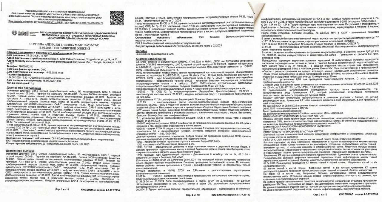 During treatment, severe complications arose: gastrointestinal problems, veno-occlusive liver disease, hemorrhagic cystitis, osteoporosis... Several times, Alena found herself on the brink of life and death in intensive care. ⚰️