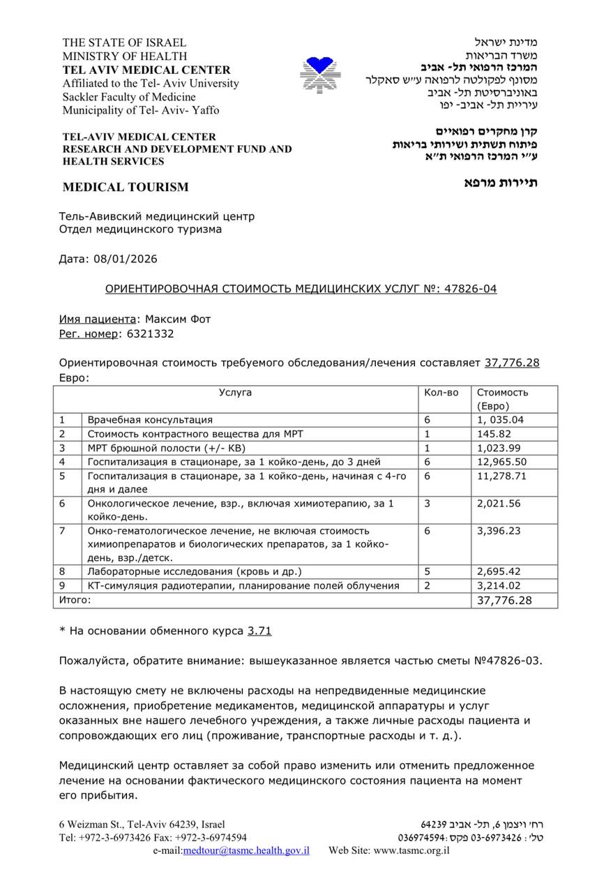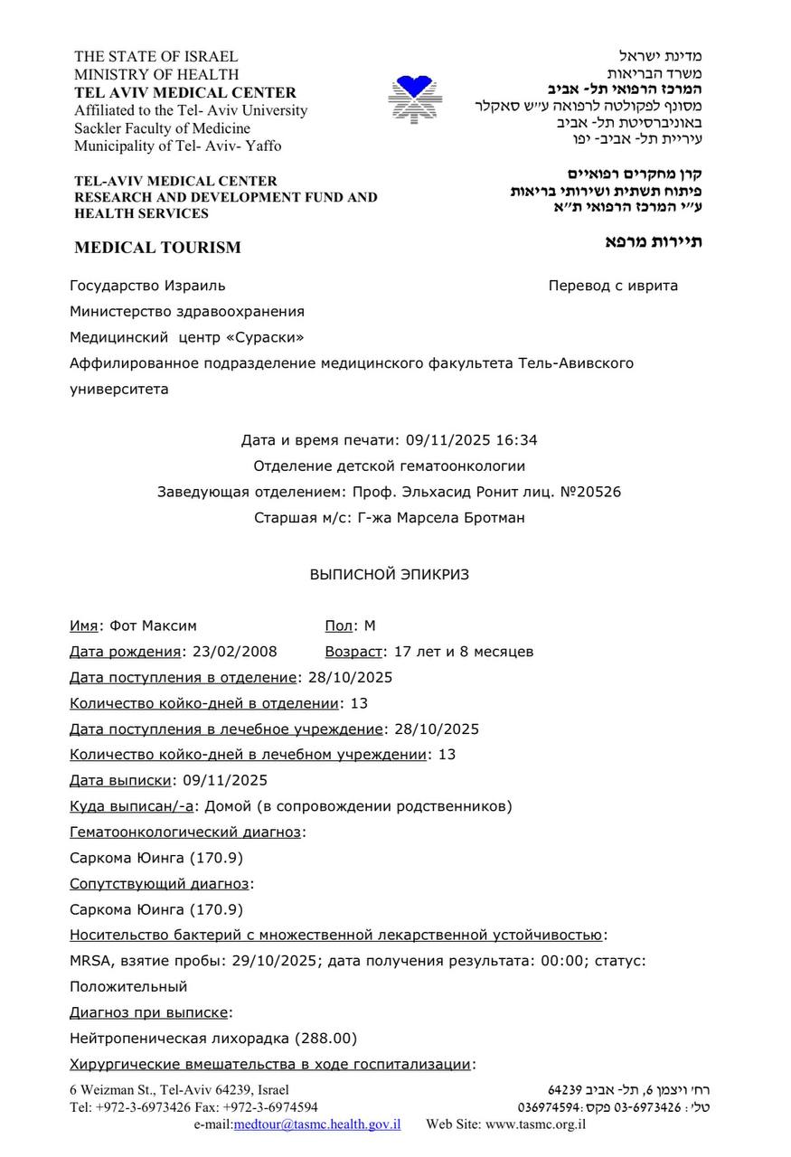Treatment is required at the Ichilov Clinic.Leczenie należy przeprowadzić w klinice Ichilova.Требуется лечение в клинике “ Ихилов”